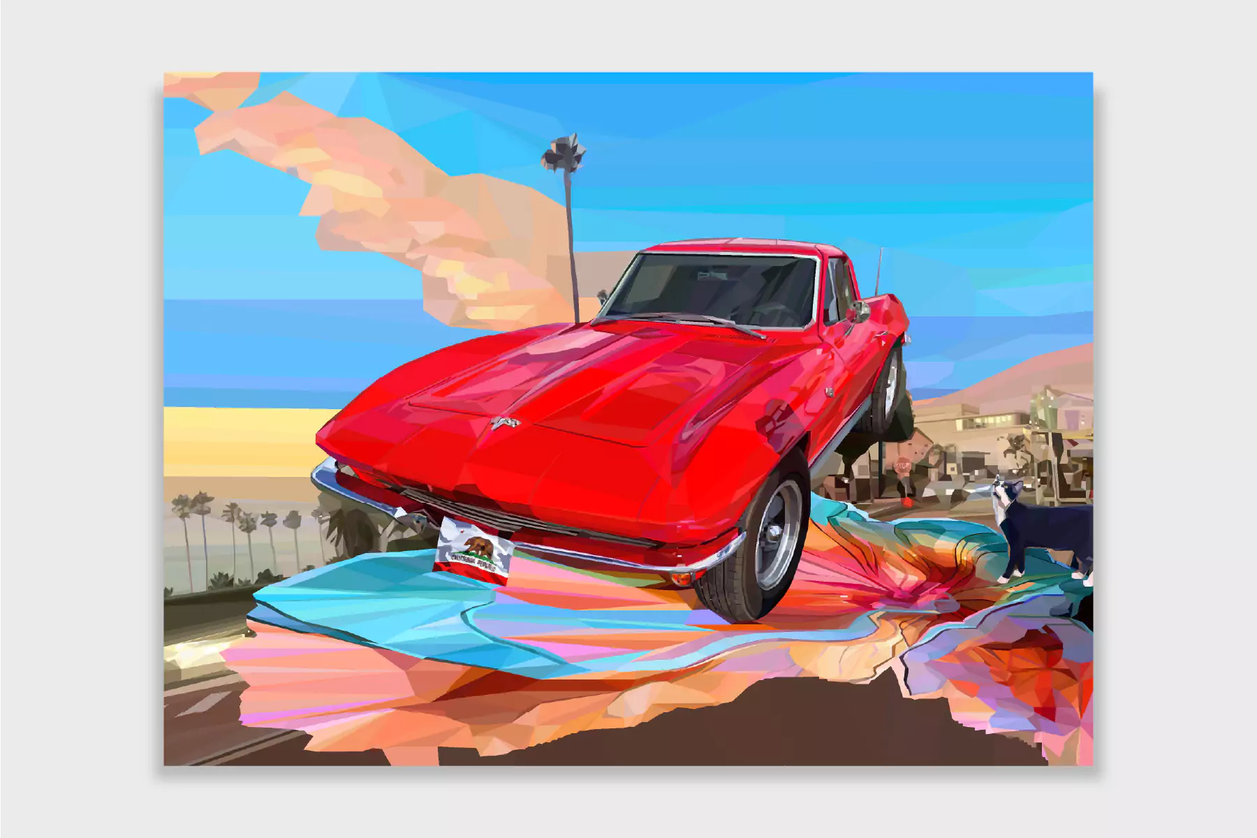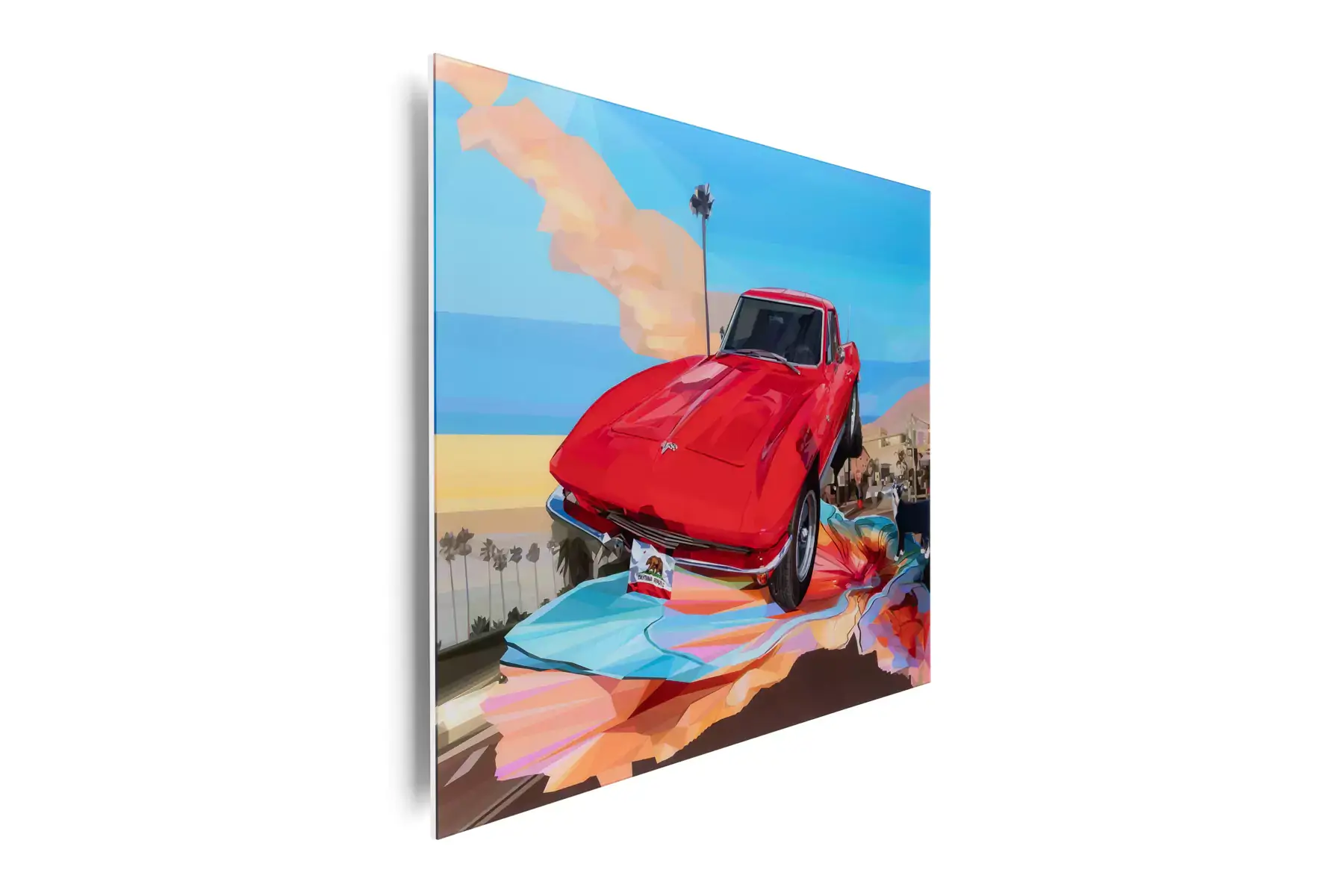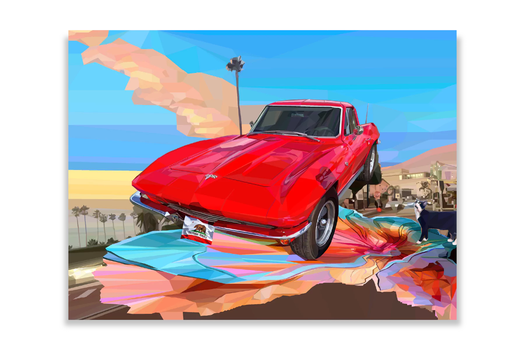 Ruby is a vivid portrayal of freedom and energy, spotlighting a bold red Chevrolet Corvette as it soars over La Jolla’s iconic Prospect Street. Bathed in the warm glow of a California sunset, the car’s striking hue stands out against a backdrop of palm trees, ocean blues, and the dynamic charm of the coastal town. The vibrant composition reflects the spirit of adventure, seamlessly blending the Corvette’s timeless allure with the relaxed elegance of La Jolla. This piece celebrates the thrill of motion and the beauty of California’s golden coast.